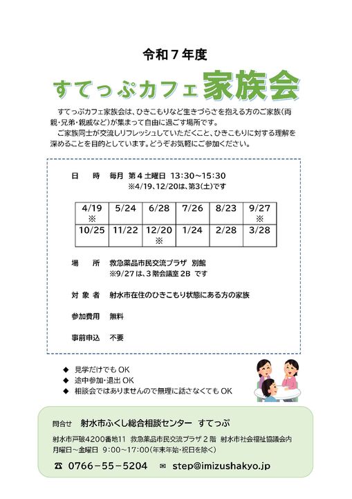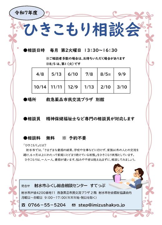 射水市ふくし総合相談センターすてっぷでは、毎月1回ひきこもり相談会を開催しています。
